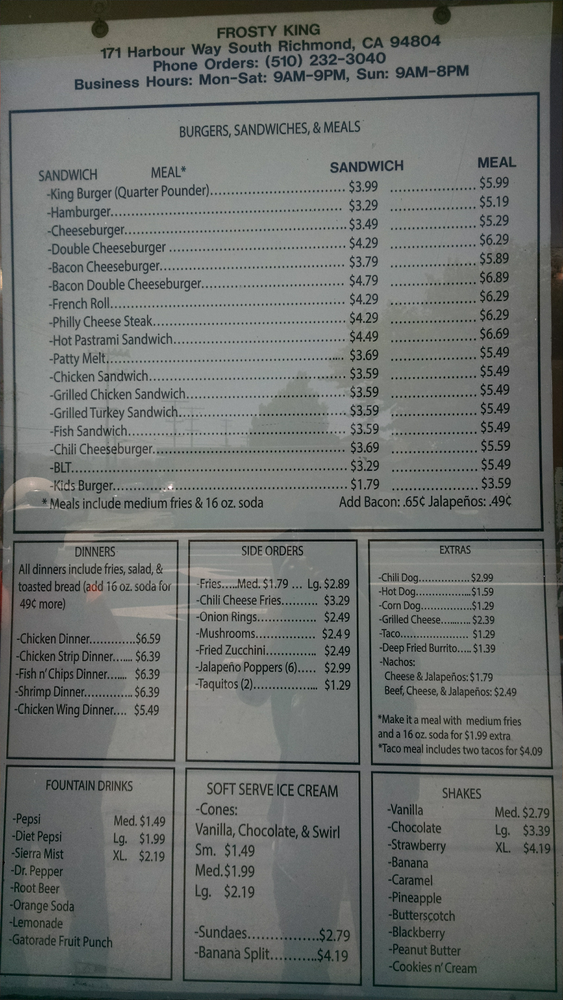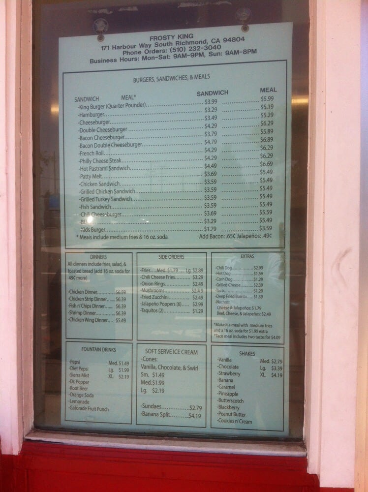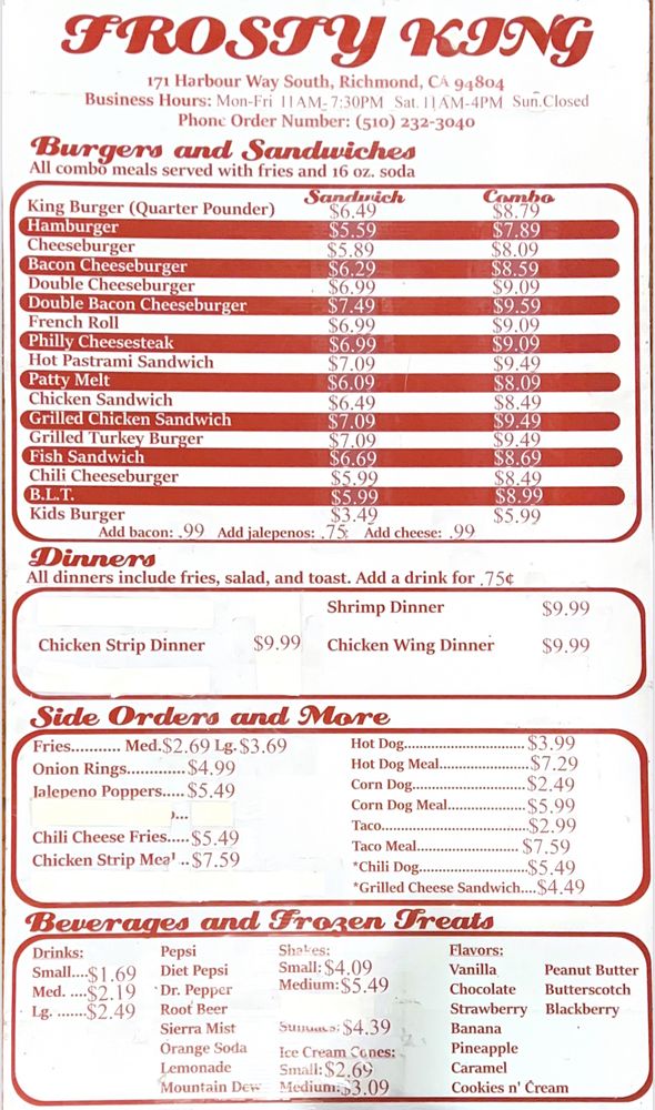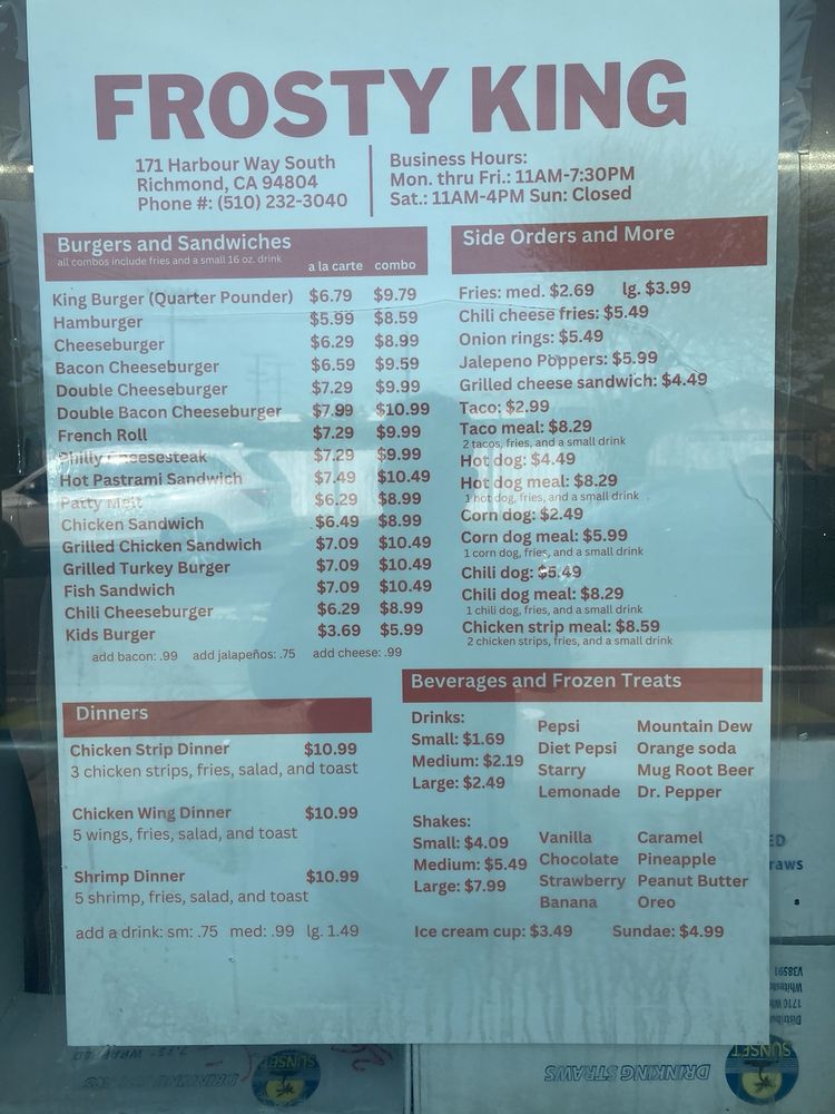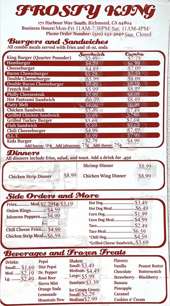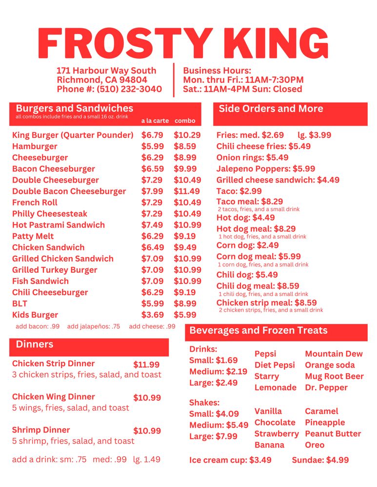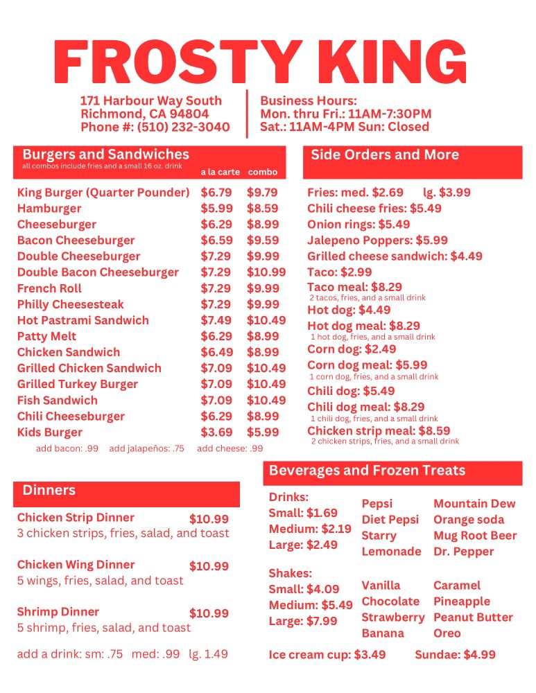 Introducing Frosty King, a delightful burger haven located at 171 Harbour Way S, Richmond, CA. This casual eatery is perfect for families and groups, offering a warm atmosphere complemented by outdoor seating and a welcoming environment for dogs.